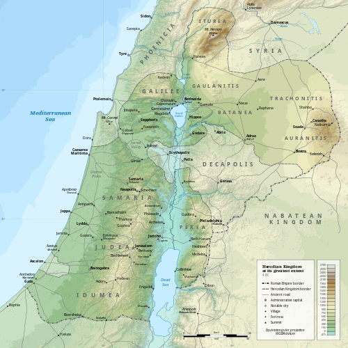 Vương quốc của Hê-rô-đê Đại Đế bao gồm các vùng Giu-đê, Sa-ma-ri-a, I-đu-mê và Ga-li-lê, cũng như một số vùng phía đông sông Gio-đan-Pê-rê, Ba-ta-nê, Hau-ran và Tra-khô-ni-tít.